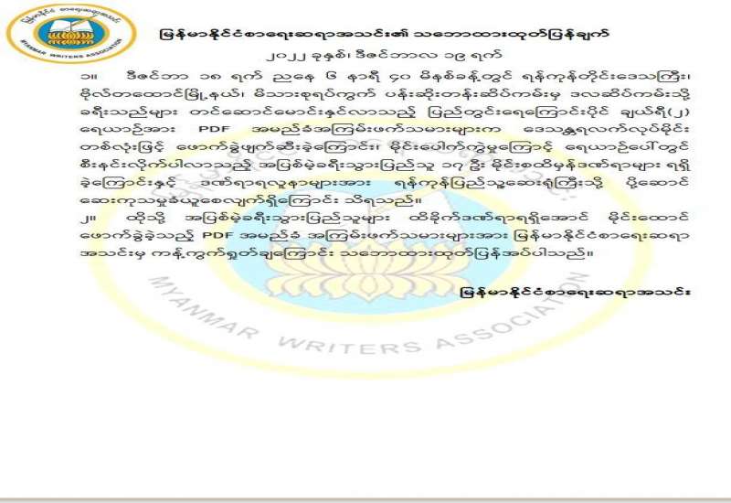 မြန်မာနိုင်ငံစာရေးဆရာအသင်း၏ သဘောထားထုတ်ပြန်ချက် ၂၀၂၂ ခုနှစ် ဒီဇင်ဘာ ၁၉