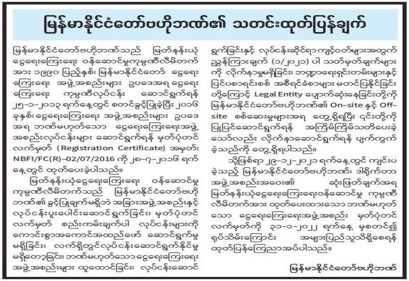 မြန်မာနိုင်ငံတော်ဗဟိုဘဏ်သည် မြတ်နန်းယုံ ငွေရေးကြေးရေး ဝန်ဆောင်မှုကုမ္ပဏီလီမိတက် အား ၁၉၉၀ ပြည့်နှစ်၊ မြန်မာနိုင်ငံတော် ငွေရေး ကြေးရေး အဖွဲ့အစည်းများ ဥပဒေအရ ငွေရေး ကြေးရေး ကုမ္ပဏီလုပ်ငန်း ဆောင်ရွက်ရန် ၂၅-၁-၂၀၁၃ ရက်နေ့တွင် စတင်ခွင့်ပြုခဲ့ပြီး ၂၀၁၆ ခုနှစ်၊ ငွေရေးကြေးရေး အဖွဲ့အစည်းများ ဥပဒေ အရ ဘဏ်မဟုတ်သော ငွေရေးကြေးရေးအဖွဲ့ အစည်းလုပ်ငန်းများ ဆောင်ရွက်ရန် မှတ်ပုံတင် လက်မှတ် (Registration Certificate) အမှတ်၊ NBFI/FC(R)-02/07/2016 ကို ၂၈-၇-၂၀၁၆ ရက် နေ့တွင် ထုတ်ပေးခဲ့ပါသည်။