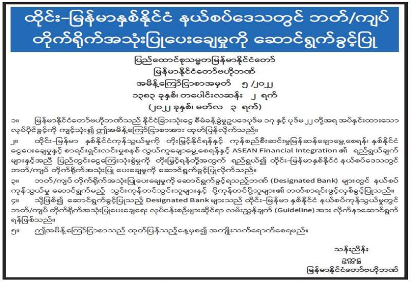 ၁။ မြန်မာနိုင်ငံတော်ဗဟိုဘဏ်သည် နိုင်ငံခြားသုံးငွေစီမံခန့်ခွဲမှုဥပဒေပုဒ်မ ၁၇ နှင့် ပုဒ်မ ၂၂ တို့အရ အပ်နှင်းထားသော လုပ်ပိုင်ခွင့်ကို ကျင့်သုံး၍ ဤအမိန့်ကြော်ငြာစာအား ထုတ်ပြန်လိုက်သည်။