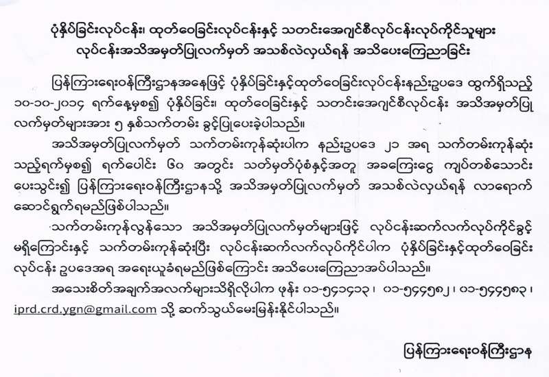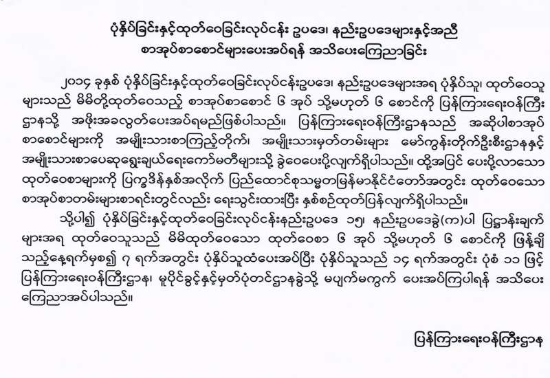 ပုံနှိပ်ခြင်းနှင့် ထုတ်ဝေခြင်းလုပ်ငန်း ဥပဒေ၊ နည်းဥပဒေများနှင့်အညီ စာအုပ်စာစောင်များ ပေးအပ်ရန် အသိပေးကြေညာခြင်း