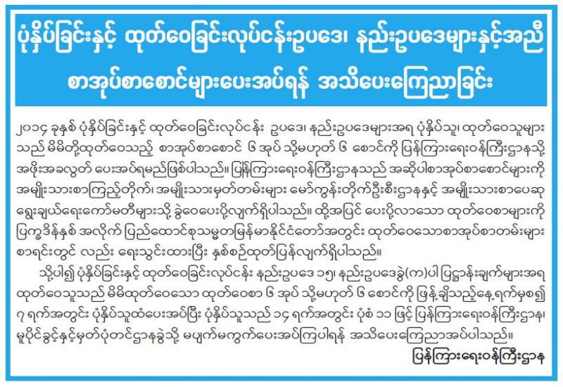 ပုံနှိပ်ခြင်းနှင့် ထုတ်ဝေခြင်းလုပ်ငန်းဥပဒေ၊ နည်းဥပဒေများနှင့်အညီ စာအုပ်စာစောင်များပေးအပ်ရန် အသိပေးကြေညာခြင်း