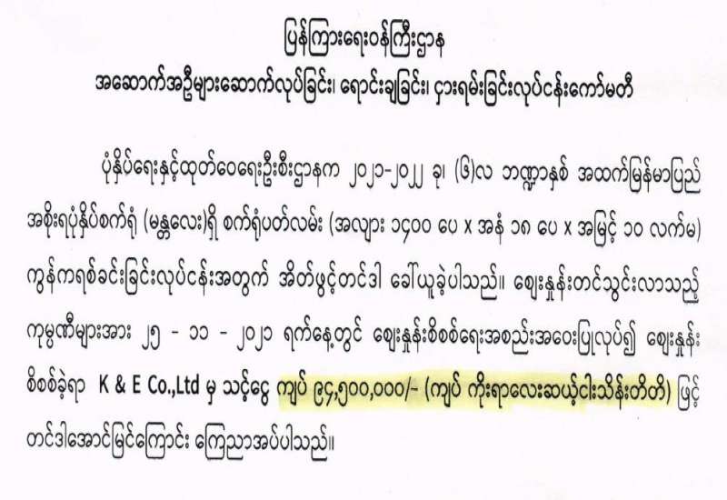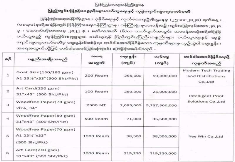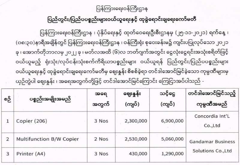 ပြည်တွင်း/ပြည်ပ ပစ္စည်းများဝယ်ယူရေးနှင့် ထုခွဲရောင်းချရေးကော်မတီအဖွဲ့ တင်ဒါအောင်မြင်ကြောင်း ကြေညာခြင်း