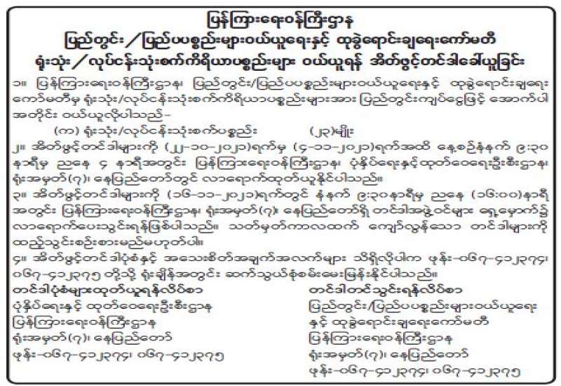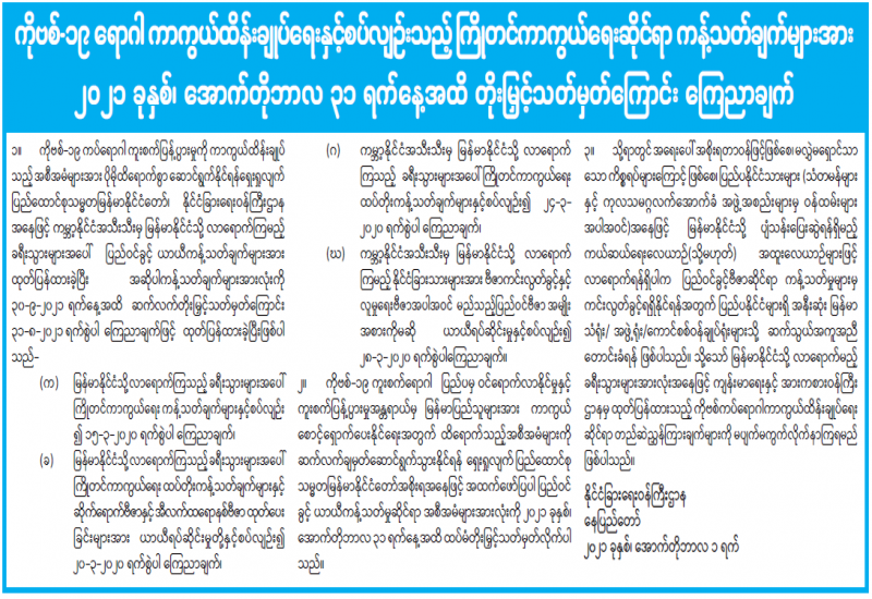 ၁။ မြန်မာနိုင်ငံတွင် ကိုဗစ်-၁၉ ရောဂါကာကွယ်ဆေးထိုးနှံခြင်းအား ကိုဗစ်-၁၉ ရောဂါဖြစ်ပွား/သေ ဆုံးမှုကို လျှော့ချရန်၊ ကူးစက်ပြန့်ပွားမှုကို တားဆီးရန်နှင့် ရောဂါဖြစ်ပွားမှု ကြောင့် နိုင်ငံ့စီးပွားရေးထိ ခိုက်မှုကိုလျှော့ချနိုင်ရန် ရည်ရွယ်ချက်များဖြင့် ဆောင်ရွက်လျက် ရှိပါသည်။