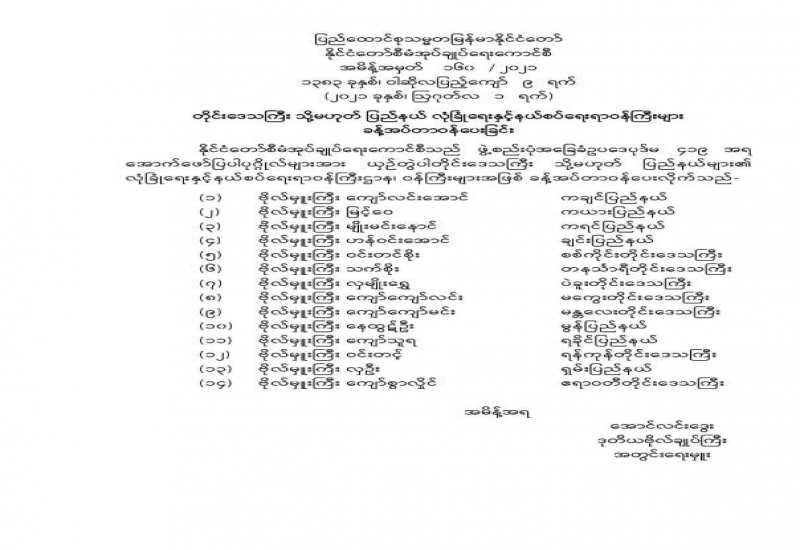 တိုင်းဒေသကြီး သို့မဟုတ် ပြည်နယ် တိုင်းရင်းသားရေးရာဝန်ကြီးများ ခန့်အပ်တာဝန်ပေးခြင်း