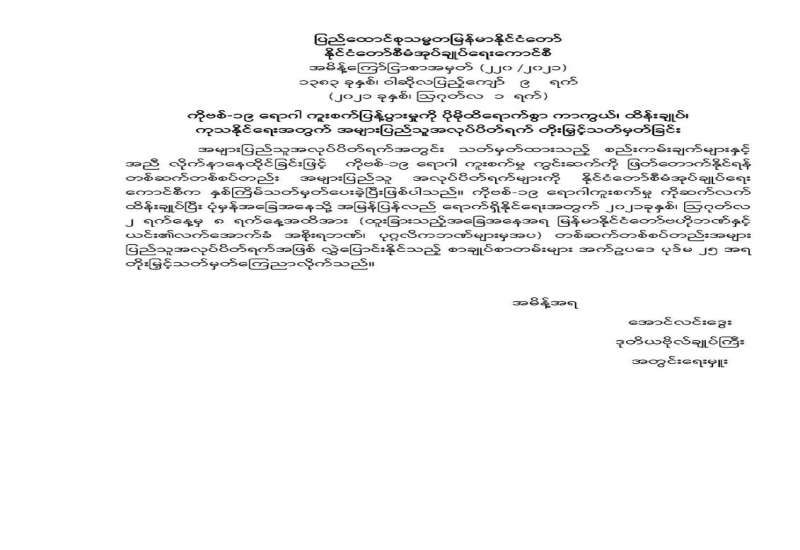 ကိုဗစ်-၁၉ ရောဂါ ကူးစက်ပြန့်ပွားမှုကို ပိုမိုထိရောက်စွာ ကာကွယ်၊ ထိန်းချုပ် ကုသနိုင်ရေးအတွက် အများပြည်သူ အလုပ်ပိတ်ရက် တိုးမြှင့်သတ်မှတ်ခြင်း