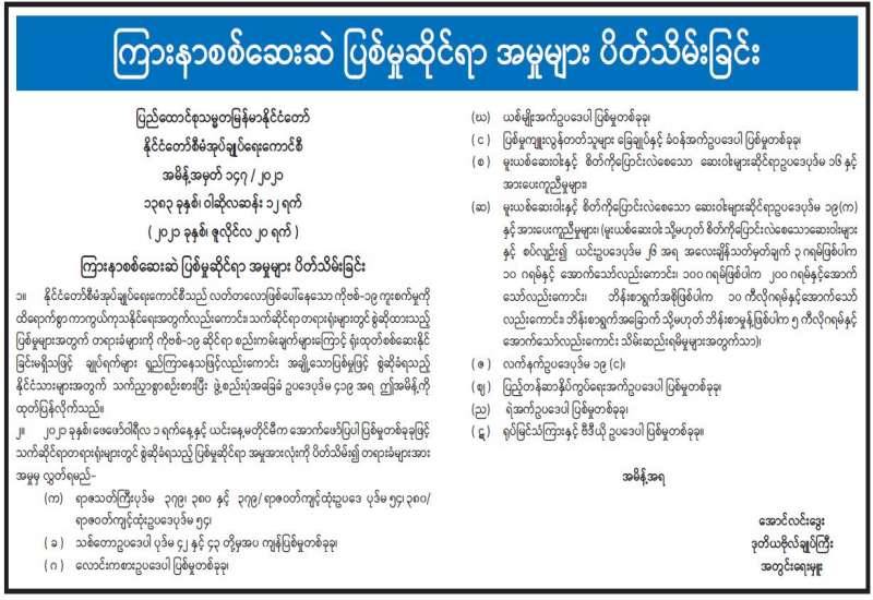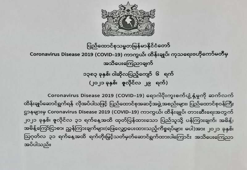 ကျန်းမာရေးနှင့် အားကစားဝန်ကြီးဌာနသည် ကူးစက်ရောဂါများ ကာကွယ်နှိမ်နင်းရေး ဥပဒေပုဒ်မ ၂၁ ပုဒ်မခွဲ (ခ)ပါ လုပ်ပိုင်ခွင့်ကို ကျင့်သုံး၍ ဤအမိန့်ကို ထုတ်ပြန်လိုက်သည်။