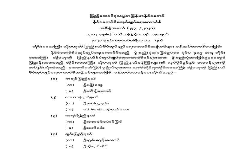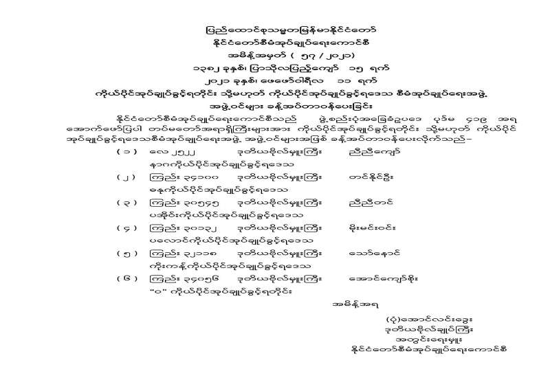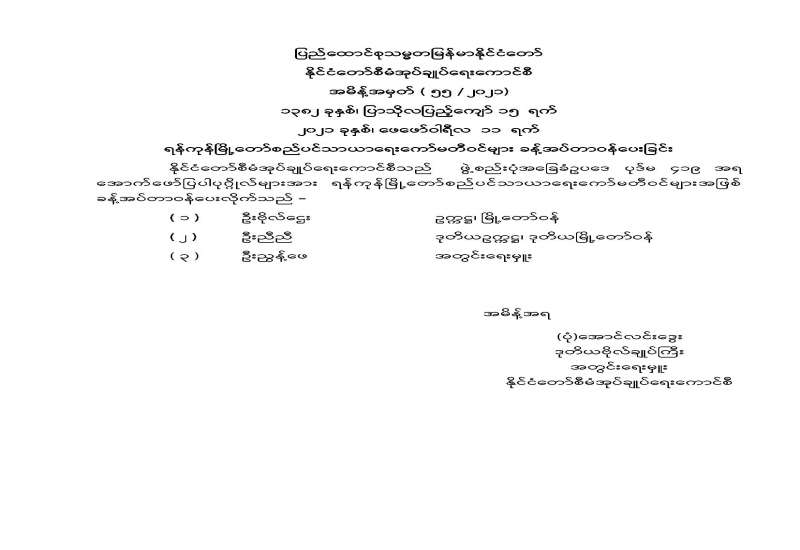 နိုင်ငံတော်စီမံအုပ်ချုပ်ရေးကောင်စီသည် ဖွဲ့စည်းပုံအခြေခံဥပဒေ ပုဒ်မ ၄၁၉ အရ အောက်ဖော်ပြပါပုဂ္ဂိုလ်များအား ရန်ကုန်မြို့တော်စည်ပင်သာယာရေးကော်မတီဝင်များအဖြစ် ခန့်အပ်တာဝန်ပေးလိုက်သည် -