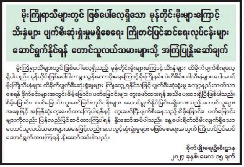 ပို့ဆောင်ရေးနှင့်ဆက်သွယ်ရေးဝန်ကြီးဌာန မြန်မာ့စာတိုက်လုပ်ငန်းမှ မြန်မာနိုင်ငံတစ်ဝန်းရှိ စာကြည့်တိုက်များ ဖွံ့ဖြိုးတိုးတက်ရေးနှင့် ပြည်သူများ စာဖတ်နှုန်းမြင့်တက်စေရန်ရည်ရွယ်၍ တစ်ဖက်တစ်လမ်းမှ ပါဝင်ဝန်ဆောင်မှုပေးသည့်အနေဖြင့် ပြန်ကြားရေးဝန်ကြီးဌာနမှ ဖွင့်လှစ်ထားသော လူထု အခြေပြုဗဟိုဌာန(စာကြည့်တိုက်)များသို့ စာအုပ်များ ပေးပို့လှူဒါန်းလိုပါက မြန်မာ့စာတိုက်လုပ်ငန်းရှိ စာတိုက်များတွင်(အခမဲ့)ပေးပို့နိုင်ပါကြောင်း ကြေညာအပ်ပါသည်။