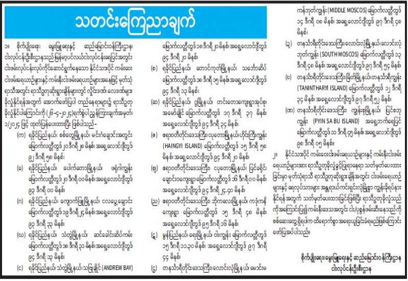 ၁။ စိုက်ပျိုးရေး၊ မွေးမြူရေးနှင့် ဆည်မြောင်းဝန်ကြီးဌာန၊ ငါးလုပ်ငန်းဦးစီးဌာနသည် မြန်မာ့ ပင်လယ်ငါးလုပ်ငန်းရေပြင်အတွင်း ငါးဖမ်းလုပ်ငန်းလုပ်ကိုင်ဆောင်ရွက်နေသော နိုင်ငံသားပိုင် ကမ်းဝေးငါးဖမ်းရေယာဉ်များနှင့် ကမ်းနီးငါးဖမ်းရေယာဉ်များအနေဖြင့် မုတ်သုံရာသီအတွင်း ရာသီဥတုဆိုးရွားချိန်များတွင် လှိုင်းဒဏ်၊ လေဒဏ်များ ခိုလှုံနိုင်ရန်အတွက် အောက်ဖော်ပြပါ တည်နေရာများ၌ ရာသီဥတုခိုလှုံနိုင်ပါကြောင်းကို (၂၆-၄-၂၀၂၄)ရက်စွဲပါ ညွှန်ကြားချက်အမှတ်၊ ၁/၂၀၂၄ ဖြင့် ထုတ်ပြန်ပေးထားပြီး ဖြစ်ပါသည်-