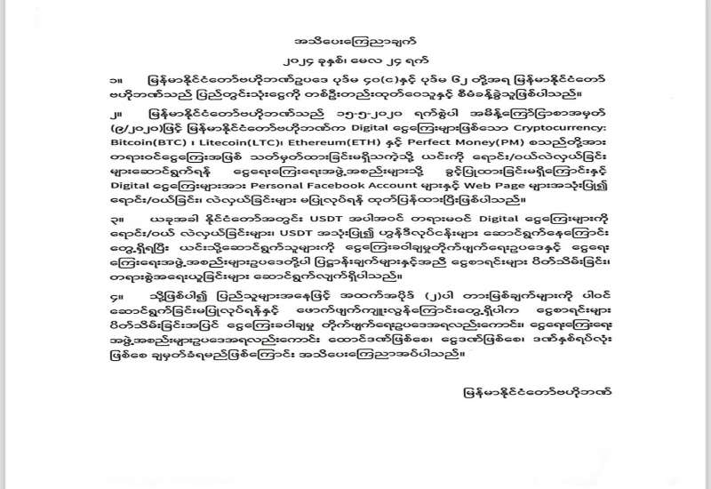 ၁။ မြန်မာနိုင်ငံတော်ဗဟိုဘဏ်ဥပဒေ ပုဒ်မ ၄၀(င)နှင့် ပုဒ်မ ၆၂ တို့အရ မြန်မာနိုင်ငံတော် ဗဟိုဘဏ်သည် ပြည်တွင်းသုံးငွေကို တစ်ဦးတည်းထုတ်ဝေသူနှင့် စီမံခန့်ခွဲသူဖြစ်ပါသည်။
