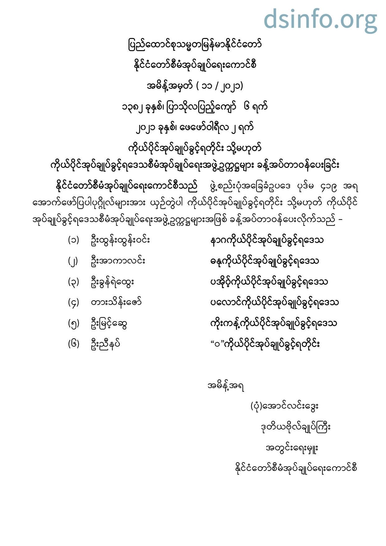 ကိုယ်ပိုင်အုပ်ချုပ်ခွင့်ရတိုင်း သို့မဟုတ် ကိုယ်ပိုင်အုပ်ချုပ်ခွင့်ရဒေသ စီမံအုပ်ချုပ်ရေးအဖွဲ့ဥက္ကဋ္ဌများ ခန့်အပ်တာဝန်ပေးခြင်း