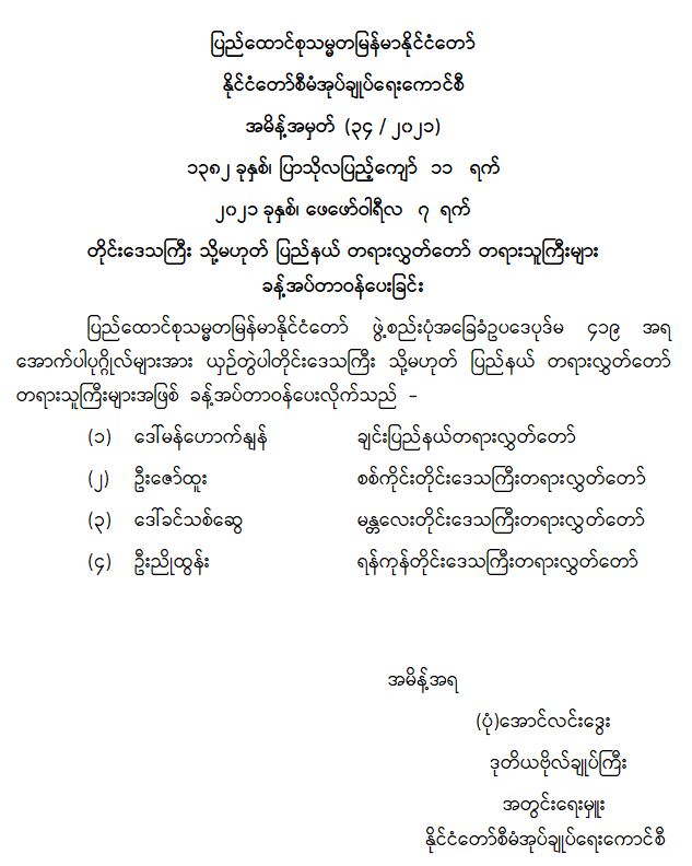 တိုင်းဒေသကြီး သို့မဟုတ် ပြည်နယ် တရားလွှတ်တော် တရားသူကြီးများ ခန့်အပ်တာဝန်ပေးခြင်း