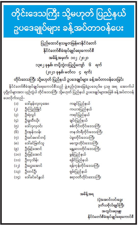 တိုင်းဒေသကြီး သို့မဟုတ် ပြည်နယ် ဥပဒေချုပ်များ ခန့်အပ်တာဝန်ပေး