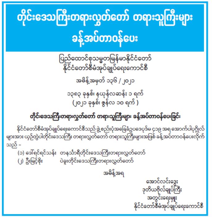 တိုင်းဒေသကြီးတရားလွှတ်တော် တရားသူကြီးများ ခန့်အပ်တာဝန်ပေး