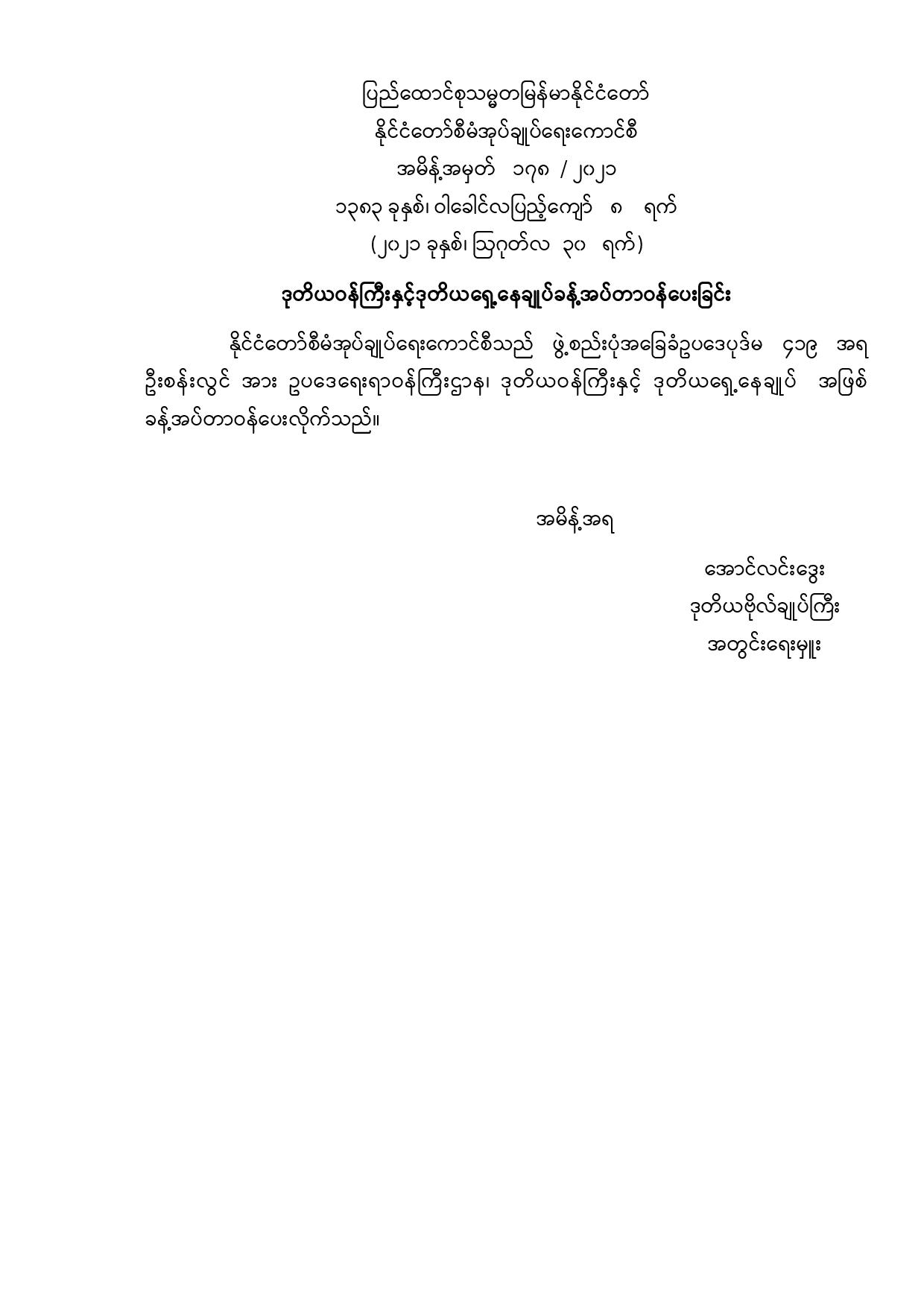 ဒုတိယဝန်ကြီးနှင့် ဒုတိယရှေ့နေချုပ် ခန့်အပ်တာဝန်ပေးခြင်း