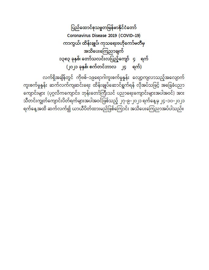 ပြည်ထောင်စုသမ္မတမြန်မာနိုင်ငံတော် Coronavirus Disease 2019 (COVID-19) ကာကွယ်၊ ထိန်းချုပ်၊ ကုသရေးဗဟိုကော်မတီမှ