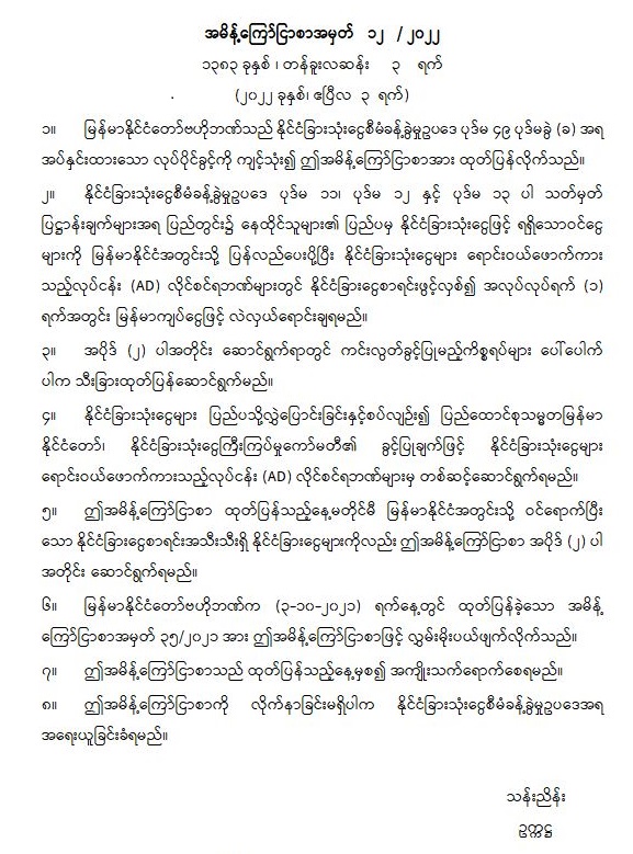 နိုင်ငံခြားသုံးငွေ စီမံခန့်ခွဲမှုနှင့်စပ်လျဉ်း၍ မြန်မာနိုင်ငံတော်ဗဟိုဘဏ်က အမိန့်ကြော်ငြာစာအမှတ် ၁၂/၂၀၂၂ ထုတ်ပြန်