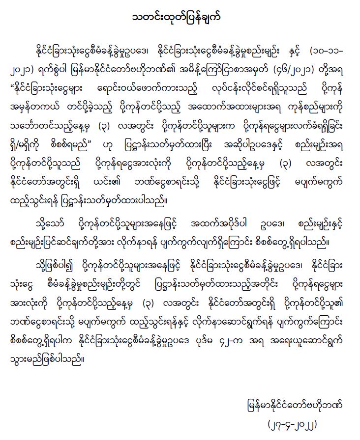 နိုင်ငံခြားသုံးငွေ စီမံခန့်ခွဲမှုနှင့် စပ်လျဉ်း၍ မြန်မာနိုင်ငံတော်ဗဟိုဘဏ်က သတင်းထုတ်ပြန်