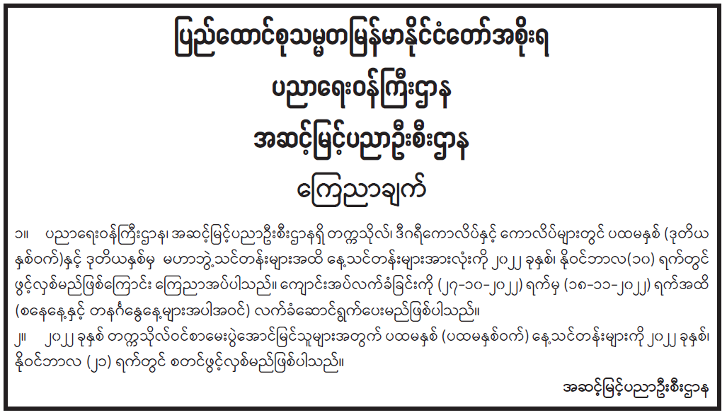 ၂၀၂၂ ခုနှစ် တက္ကသိုလ်ဝင်စာမေးပွဲ အောင်မြင်သူများအတွက် ကြေညာချက်