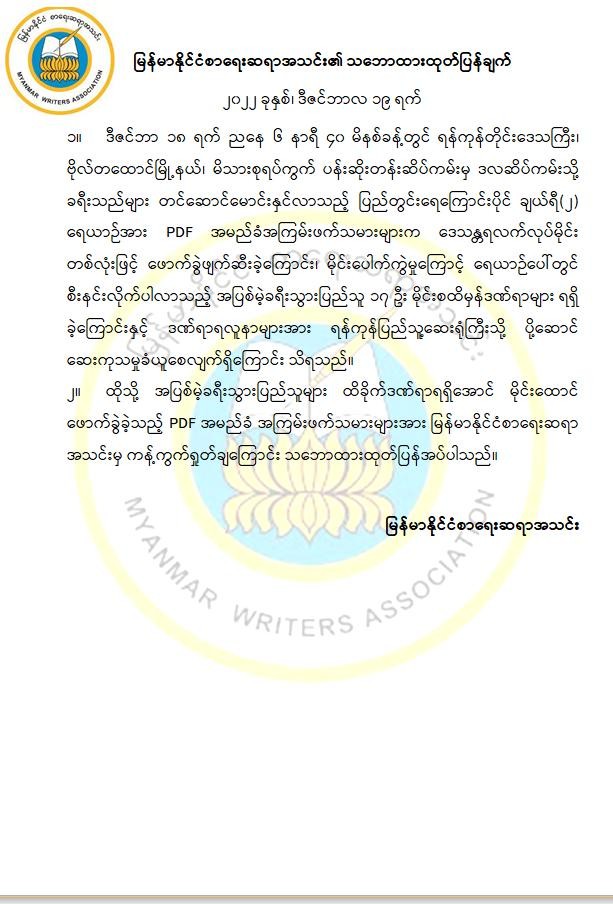 မြန်မာနိုင်ငံစာရေးဆရာအသင်း၏ သဘောထားထုတ်ပြန်ချက်