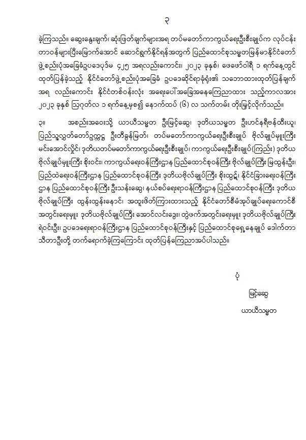 ၁။ ပြည်ထောင်စုသမ္မတမြန်မာနိုင်ငံတော်၊ အမျိုးသားကာကွယ်ရေးနှင့် လုံခြုံရေးကောင်စီ အစည်းအဝေး(၂/၂၀၂၃)ကို ၂၀၂၃ ခုနှစ်၊ ဇူလိုင်လ ၃၁ ရက်နေ့ (၀၉၃၀) နာရီတွင် ကျင်းပခဲ့သည်။ အစည်းအဝေးတွင် တပ်မတော်ကာကွယ်ရေးဦးစီးချုပ် ဗိုလ်ချုပ်မှူးကြီးမင်းအောင်လှိုင်က ထပ်မံသက်တမ်းတိုးထားသည့် ၆ လ တာကာလအတွင်း နိုင်ငံဖွံ့ဖြိုးတိုးတက်မှုကို အရှိန်အဟုန်မြှင့်တင်ဆောင်ရွက်နိုင်ရန်၊ နိုင်ငံရေးလုပ်ငန်းစဉ် (၂) ရပ်နှင့် အမျိုးသားရေးလုပ်ငန်းစဉ် (၂) ရပ်တို့ကို အကောင်အထည်ဖော်ဆောင်ရွက်ရာတွင် ပိုမိုလျင်မြန်စွာဆောင်ရွက်နိုင်ရန် ၂၀၂၃ ခုနှစ်၊ ဖေဖော်ဝါရီလ ၄ ရက်တွင် ရှေ့လုပ်ငန်းစဉ်(၅)ရပ်နှင့် ဦးတည်ချက်(၁၂)ရပ်ကို ပြင်ဆင်ခြင်း၊ ထပ်မံဖြည့်စွက်ခြင်းတို့ကို ဆောင်ရွက်ခဲ့မှုအခြေအနေများ၊ ရှေ့လုပ်ငန်းစဉ်နှင့် ဦးတည်ချက်များကို အလေးအနက်ထား အကောင်အထည်ဖော်ဆောင်ရွက်နိုင်ခဲ့မှုကြောင့် နိုင်ငံရေး၊ လူမှုစီးပွားဘဝ ဖွံ့ဖြိုးတိုးတက်ရေးတို့၌ တိုးတက်မှုများရရှိခဲ့သည့် အခြေအနေများ၊ အကြမ်းဖက်အဖွဲ့များဖြစ်သည့် NUGI CRPH၊ PDF အမည်ခံအကြမ်းဖက်အဖွဲ့များ၏ အကြမ်းဖက်တိုက်ခိုက်မှုများ၊ ပညာရေး ကဏ္ဍမြင့်မားတိုးတက်စေရေး ကြိုးပမ်းအကောင်အထည်ဖော်လျက်ရှိမှုနှင့် အကြမ်းဖက်သမားများ၏ ပညာရေးကဏ္ဍနိမ့်ကျစေရေး အကြမ်းဖက်မှုများကို လုပ်ဆောင်လျက်ရှိသည့် အခြေအနေများ၊ ပြည်သူလူထု၏ ပူးပေါင်းပါဝင်သတင်းပို့မှုများကြောင့် ဖမ်းဆီးရရှိမှုအခြေအနေများ၊ စိုက်ပျိုးမွေးမြူရေးကိုအခြေခံသည့် MSME လုပ်ငန်းများ တိုးတက်ဖွံ့ဖြိုးစေရေး ဖြည့်ဆည်းဆောင်ရွက် ပေးလျက်ရှိသည့် အခြေအနေများ၊ ဘဏ္ဍာရေးနှစ်အလိုက် GDP တိုးတက်လာမှုနှင့် ၂၀၂၃-၂၀၂၄ ဘဏ္ဍာရေးနှစ်တွင် GDP ဆက်လက်တိုးတက်စေရေး မျှော်မှန်းဆောင်ရွက်လျက်ရှိသည့် အခြေအနေများ၊ နိုင်ငံရေးပါတီများ မှတ်ပုံတင်ခြင်းဥပဒေကို ပြဌာန်းဆောင်ရွက်ခဲ့မှုနှင့် လုံခြုံရေးအရ ဆက်လက်ဆောင်ရွက်ပေးရန် လိုအပ်မည့်အခြေအနေများ၊ တစ်နိုင်ငံလုံးထာဝရငြိမ်းချမ်းရေး ရရှိရေးအတွက် NCA လက်မှတ်ရေးထိုးထားသည့် တိုင်းရင်းသားလက်နက်ကိုင်အဖွဲ့အစည်းများ၊ NCA လက်မှတ်ရေးထိုးထားခြင်းမရှိသည့် တိုင်းရင်းသားလက်နက်ကိုင်အဖွဲ့ အစည်းများနှင့်တွေ့ဆုံဆွေးနွေးမှုများကို ဆောင်ရွက်ခဲ့သည့်အခြေအနေများ၊ ငြိမ်းချမ်းရေးဆွေးနွေးမှုများကို ဆက်လက်ဆောင်ရွက်သွားမည့် အခြေအနေများ၊ ၂၀၂၀ ပြည့်နှစ်ရွေးကောက်ပွဲတွင် မဲမသမာမှုဖြစ်စဉ်များ ပေါ်ပေါက်ခဲ့သည့် အခြေအနေများ၊ မဲစာရင်းမှန်ကန်တိကျမှုရှိစေရေးအတွက် အဓိကကျသည့် သန်းခေါင်စာရင်း ကောက်ယူရေးဆောင်ရွက်လျက်ရှိသည့် အခြေအနေများနှင့် အကြမ်းဖက်သမားများ၏ နှောင့်ယှက်တိုက်ခိုက်မှုကြေ