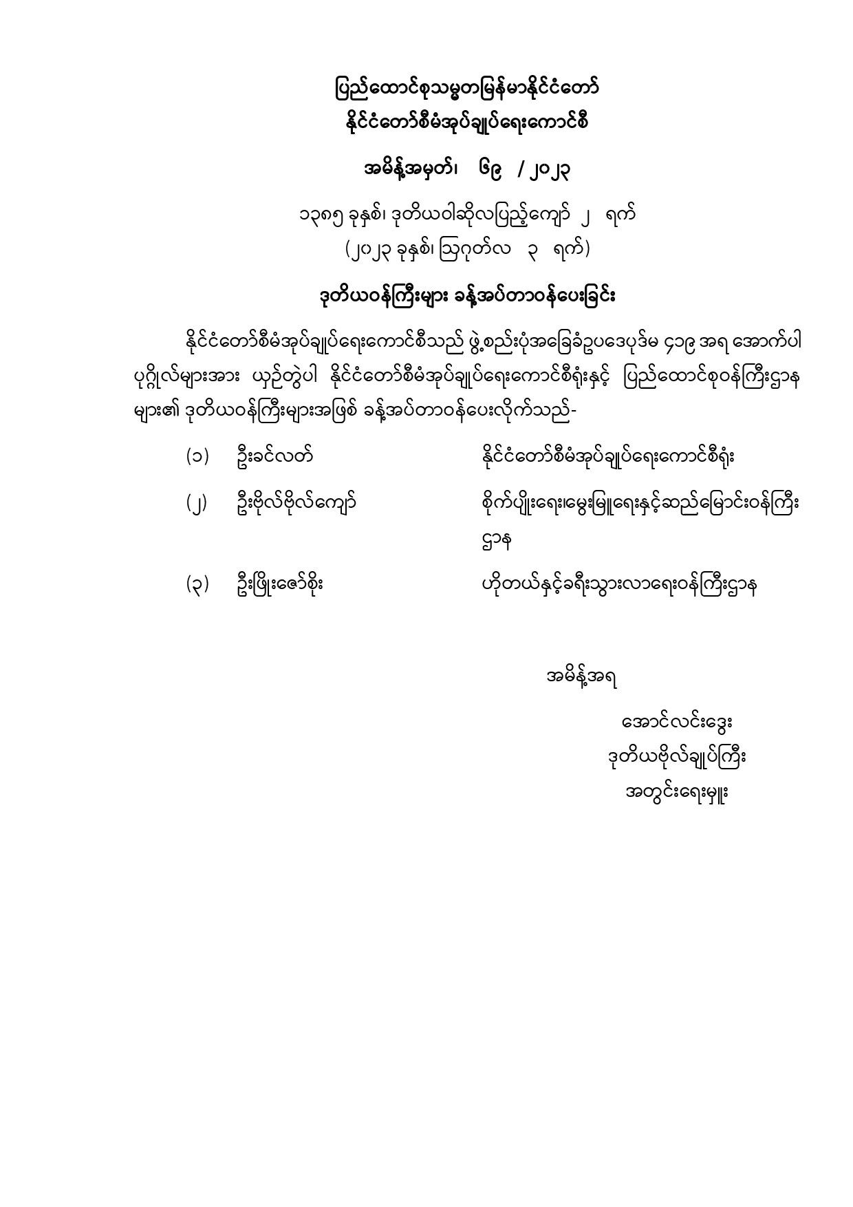 ဒုတိယဝန်ကြီးများ ခန့်အပ်တာဝန်ပေးခြင်း