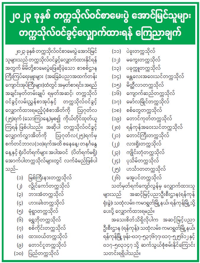 ၂၀၂၃ ခုနှစ် တက္ကသိုလ်ဝင်စာမေးပွဲ အောင်မြင်သူများ တက္ကသိုလ်ဝင်ခွင့်လျှောက်ထားရန် ကြေညာချက် 08/18/2023 ၂၀၂၃ ခုနှစ် တက္ကသိုလ်ဝင်စာမေးပွဲ အောင်မြင်သူများ တက္ကသိုလ်ဝင်ခွင့်လျှောက်ထားရန် ကြေညာချက်