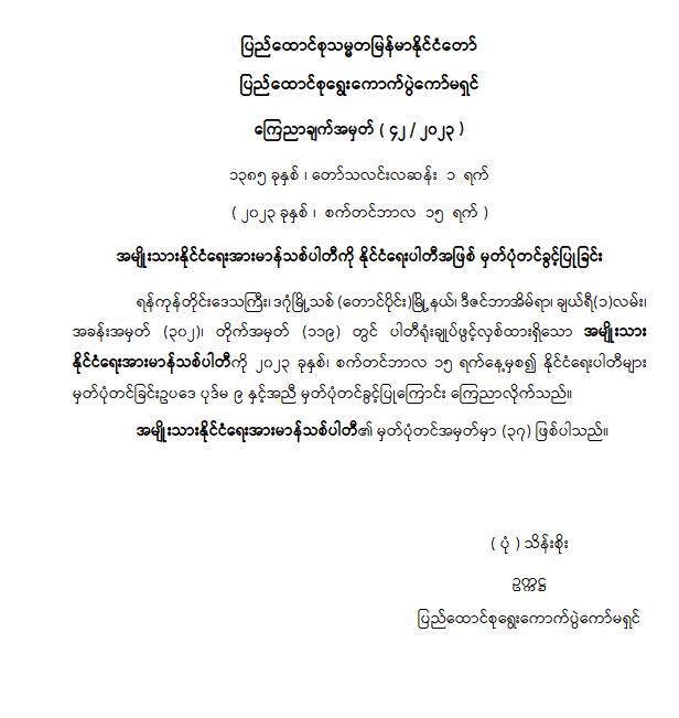 အမျိုးသားနိုင်ငံရေးအားမာန်သစ်ပါတီကို နိုင်ငံရေးပါတီအဖြစ် မှတ်ပုံတင်ခွင့်ပြုခြင်း