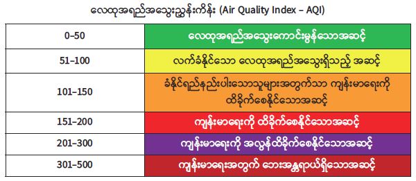 မြန်မာနိုင်ငံတစ်ဝန်းရှိ ဝန်းကျင်လေထုအရည်အသွေးအခြေအနေအား လေ့လာဆန်းစစ်နိုင်ရန်အတွက် ပတ်ဝန်းကျင်ထိန်းသိမ်းရေးဦးစီးဌာနအနေဖြင့် ပြည်ထောင်စုနယ်မြေ/ တိုင်းဒေသကြီး/ ပြည်နယ်များရှိ သတ်မှတ် Sampling Point နေရာများတွင် ဝန်းကျင်လေထုအရည်အသွေးကို Environmental Perimeter Air Station (EPAS) - Haz-Scanner ၊ Air Quality Monitoring Station (AQM-65) ၊ Scentroid (SL– 50 Scential) ၊ Aeroqual (Series – 500 Portable Air Quality Monitor)၊ AQMesh (Dust Analyzer - 1941150)၊ (Gas Analyzer - 1940150)၊ Portable Beta Attenuation Mass Monitor (BAM 1022)၊ Air Quality Monitoring Station (AQMS) နှင့် Continuous Particulate Monitor များအသုံးပြု၍ Particulate Matter 2.5 (PM2.5) ၊ Particulate Matter 10 (PM10) ၊ Sulphur Dioxide (SO2) ၊ Nitrogen Dioxide (NO2)၊ Ozone (O3) နှင့် Carbon Monoxide (CO) စသည့် အဓိက Parameter များကို ပုံမှန်တိုင်းတာပြီး လေ့လာ ဆန်းစစ်လျက်ရှိပါသည်။