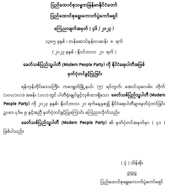 ခေတ်သစ်ပြည်သူ့ပါတီ (Modern People Party) ကို နိုင်ငံရေးပါတီအဖြစ် မှတ်ပုံတင်ခွင့်ပြုခြင်း