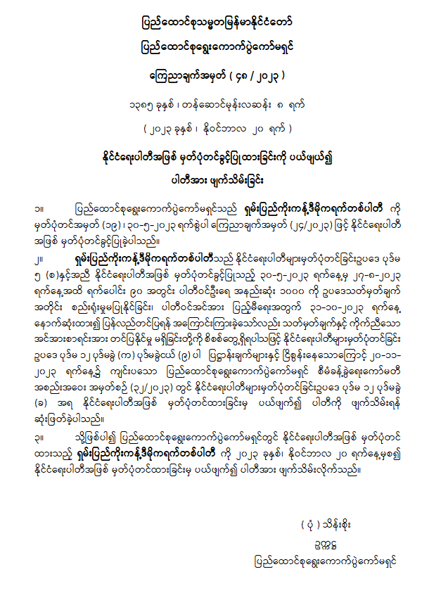 နိုင်ငံရေးပါတီအဖြစ် မှတ်ပုံတင်ခွင့်ပြုထားခြင်းကို ပယ်ဖျယ်၍ ပါတီအား ဖျက်သိမ်းခြင်း