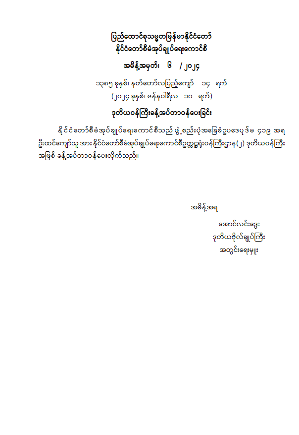 ပြည်ထောင်စုသမ္မတမြန်မာနိုင်ငံတော် နိုင်ငံတော်စီမံအုပ်ချုပ်ရေးကောင်စီ အမိန့်အမှတ်၊ ၆ / ၂၀၂၄ ၁၃၈၅ ခုနှစ်၊ နတ်တော်လပြည့်ကျော် ၁၄ ရက် (၂၀၂၄ ခုနှစ်၊ ဇန်နဝါရီလ ၁၀ရက်) ဒုတိယဝန်ကြီးခန့်အပ်တာဝန်ပေးခြင်း 01/10/2024