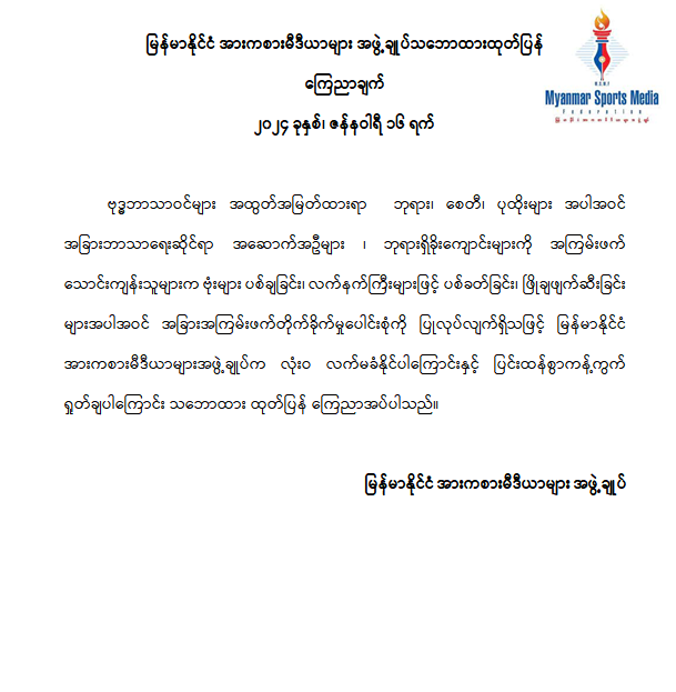 မြန်မာနိုင်ငံ အားကစားမီဒီယာများ အဖွဲ့ချုပ် သဘောထားထုတ်ပြန်ကြေညာချက်