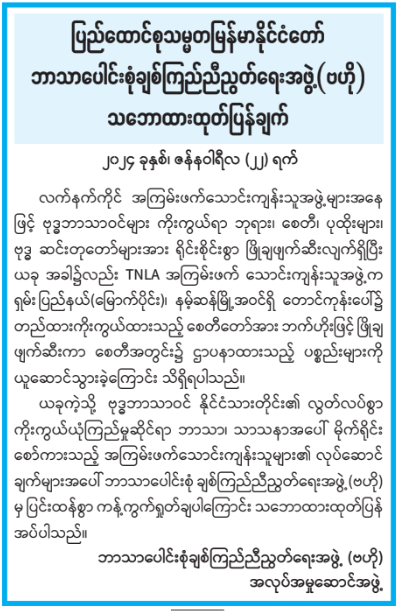ယခုကဲ့သို့ ဗုဒ္ဓဘာသာဝင် နိုင်ငံသားတိုင်း၏ လွတ်လပ်စွာ ကိုးကွယ်ယုံကြည်မှုဆိုင်ရာ ဘာသာ၊ သာသနာအပေါ် မိုက်ရိုင်း စော်ကားသည့် အကြမ်းဖက်သောင်းကျန်းသူများ၏ လုပ်ဆောင် ချက်များအပေါ် ဘာသာပေါင်းစုံ ချစ်ကြည်ညီညွတ်ရေးအဖွဲ့(ဗဟို)မှ ပြင်းထန်စွာ ကန့်ကွက်ရှုတ်ချပါကြောင်း သဘောထားထုတ်ပြန် အပ်ပါသည်။