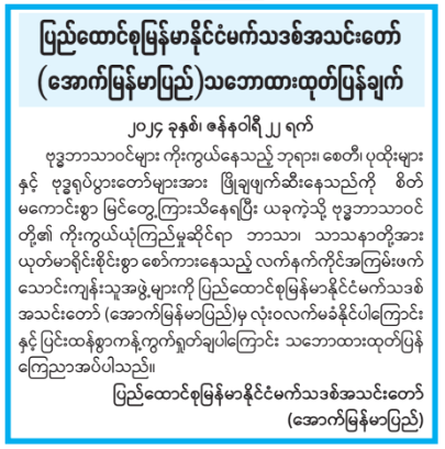 ဗုဒ္ဓဘာသာဝင်များ ကိုးကွယ်နေသည့် ဘုရား၊ စေတီ၊ ပုထိုးများနှင့် ဗုဒ္ဓရုပ်ပွားတော်များအား ဖြိုချဖျက်ဆီးနေသည်ကို စိတ်မကောင်းစွာ မြင်တွေ့ကြားသိနေရပြီး ယခုကဲ့သို့ ဗုဒ္ဓဘာသာဝင်တို့၏ ကိုးကွယ်ယုံကြည်မှုဆိုင်ရာ ဘာသာ၊ သာသနာတို့အား ယုတ်မာရိုင်းစိုင်းစွာ စော်ကားနေသည့် လက်နက်ကိုင်အကြမ်းဖက် သောင်းကျန်းသူအဖွဲ့များကို ပြည်ထောင်စုမြန်မာနိုင်ငံမက်သဒစ် အသင်းတော် (အောက်မြန်မာပြည်)မှ လုံးဝလက်မခံနိုင်ပါကြောင်းနှင့် ပြင်းထန်စွာကန့်ကွက်ရှုတ်ချပါကြောင်း သဘောထားထုတ်ပြန် ကြေညာအပ်ပါသည်။