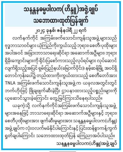 ယခုကဲ့သို့ လက်နက်ကိုင်အကြမ်းဖက်သောင်းကျန်းသူအဖွဲ့များအနေဖြင့် ဘာသာရေးဆိုင်ရာ အဆောက်အဦများနှင့် ဘုရား၊ စေတီပုထိုးများအား ဖျက်ဆီးမှုများအား သနန္တနဓမ္မပါလက(ဟိန္ဒူ)အဖွဲ့ချုပ်က လုံးဝလက်မခံနိုင်ပါကြောင်းနှင့် ပြင်းထန်စွာကန့်ကွက် ရှုတ်ချပါကြောင်း သဘောထားထုတ်ပြန် ကြေညာအပ်ပါသည်။