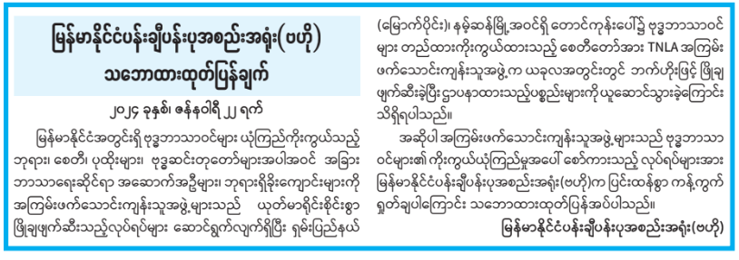 မြန်မာနိုင်ငံအတွင်းရှိ ဗုဒ္ဓဘာသာဝင်များ ယုံကြည်ကိုးကွယ်သည့် ဘုရား၊ စေတီ၊ ပုထိုးများ၊ ဗုဒ္ဓဆင်းတုတော်များအပါအဝင် အခြား ဘာသာရေးဆိုင်ရာ အဆောက်အဦများ၊ ဘုရားရှိခိုးကျောင်းများကို အကြမ်းဖက်သောင်းကျန်းသူအဖွဲ့များသည် ယုတ်မာရိုင်းစိုင်းစွာ ဖြိုချဖျက်ဆီးသည့်လုပ်ရပ်များ ဆောင်ရွက်လျက်ရှိပြီး ရှမ်းပြည်နယ် (မြောက်ပိုင်း)၊ နမ့်ဆန်မြို့အဝင်ရှိ တောင်ကုန်းပေါ်၌ ဗုဒ္ဓဘာသာဝင်များ တည်ထားကိုးကွယ်ထားသည့် စေတီတော်အား TNLA အကြမ်း ဖက်သောင်းကျန်းသူအဖွဲ့က ယခုလအတွင်းတွင် ဘက်ဟိုးဖြင့် ဖြိုချ ဖျက်ဆီးခဲ့ပြီး ဌာပနာထားသည့်ပစ္စည်းများကို ယူဆောင်သွားခဲ့ကြောင်း သိရှိရပါသည်။