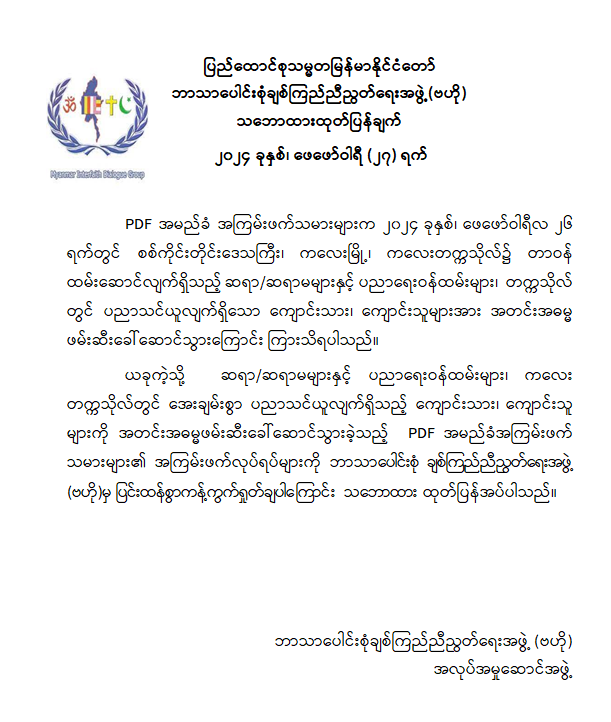 ပြည်ထောင်စုသမ္မတမြန်မာနိုင်ငံတော် ဘာသာပေါင်းစုံချစ်ကြည်ညီညွတ်ရေးအဖွဲ့(ဗဟို) သဘောထားထုတ်ပြန်ချက် 02/27/2024