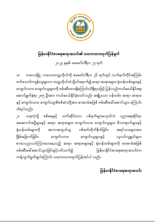 မြန်မာနိုင်ငံစာရေးဆရာအသင်း၏ သဘောထားထုတ်ပြန်ချက်