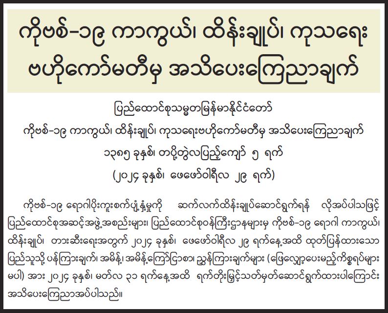 ကိုဗစ်-၁၉ ရောဂါပိုးကူးစက်ပျံ့နှံ့မှုကို ဆက်လက်ထိန်းချုပ်ဆောင်ရွက်ရန်လိုအပ်ပါသဖြင့် ပြည်ထောင်စုအဆင့်အဖွဲ့အစည်းများ၊ ပြည်ထောင်စုဝန်ကြီးဌာနများမှ ကိုဗစ်-၁၉ ရောဂါ ကာကွယ်၊ ထိန်းချုပ်၊ တားဆီးရေးအတွက် ၂၀၂၄ ခုနှစ်၊ ဖေဖော်ဝါရီလ ၂၉ ရက်နေ့အထိ ထုတ်ပြန်ထားသော ပြည်သူသို့ပန်ကြားချက်၊ အမိန့်၊ အမိန့်ကြော်ငြာစာ၊ ညွှန်ကြားချက်များ (ဖြေလျှော့ပေးမည့်ကိစ္စရပ်များမပါ)အား ၂၀၂၄ ခုနှစ်၊ မတ်လ ၃၁ ရက်နေ့အထိ ရက်တိုးမြှင့်သတ်မှတ်ဆောင်ရွက်ထားပါကြောင်း အသိပေးကြေညာအပ်ပါသည်။