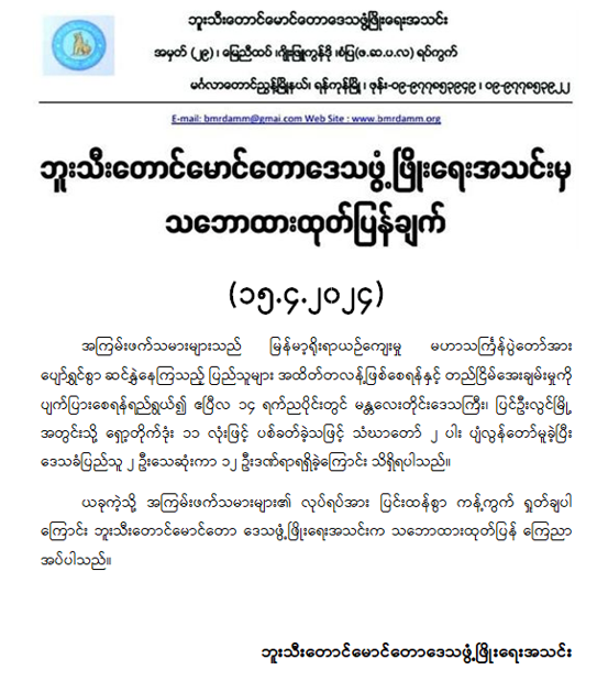 ဘူးသီးတောင်မောင်တောဒေသဖွံ့ဖြိုးရေးအသင်းမှ သဘောထားထုတ်ပြန်ချက်