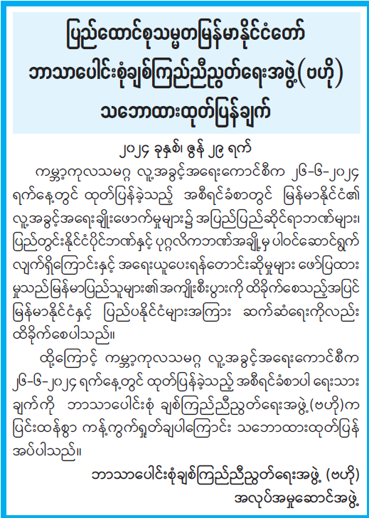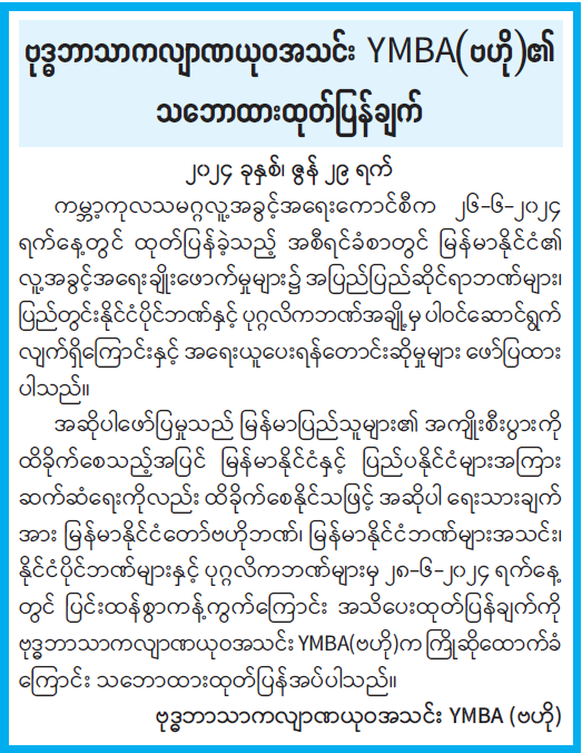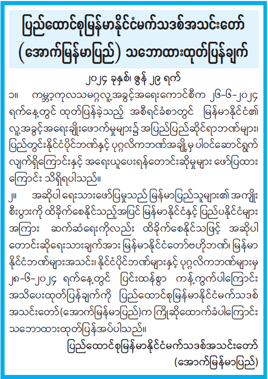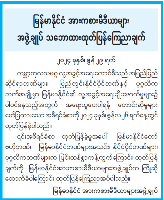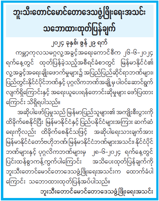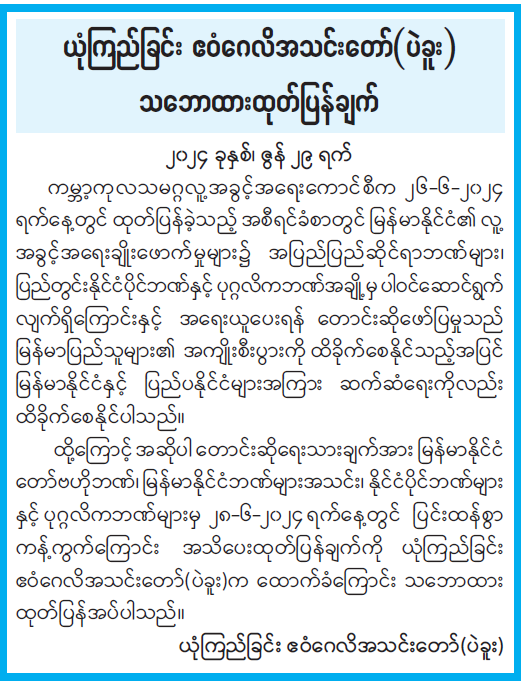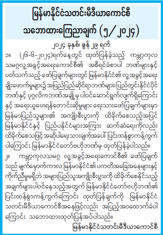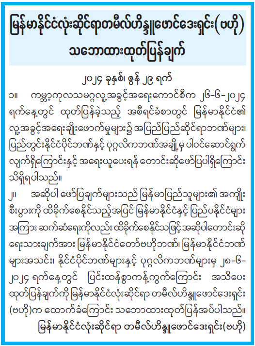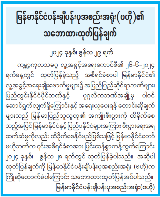 အဆိုပါ ကမ္ဘာ့ကုလသမဂ္ဂလူ့အခွင့်အရေးကောင်စီ၏ အစီရင်ခံစာပါ ရေးသားချက်များအပေါ် ပြင်းထန်စွာ ကန့်ကွက်ကြောင်း မြန်မာနိုင်ငံတော်ဗဟိုဘဏ်၊ မြန်မာနိုင်ငံဘဏ်များအသင်း၊ နိုင်ငံပိုင်ဘဏ်များ၊ ပုဂ္ဂလိကဘဏ်များ၏ သဘောထားထုတ်ပြန်ချက်ကို မြန်မာနိုင်ငံသတင်းမီဒီယာကောင်စီ၊ ဗုဒ္ဓဘာသာကလျာဏယုဝအသင်းYMBA (ဗဟို)၊ ဘာသာပေါင်းစုံ ချစ်ကြည်ညီညွတ်ရေးအဖွဲ့ (ဗဟို)၊ သနန္တနဓမ္မပါလက (ဟိန္ဒူ) အဖွဲ့ချုပ်၊ ပြည်ထောင်စုမြန်မာနိုင်ငံမက်သဒစ်အသင်းတော် (အောက်မြန်မာပြည်)၊ မြန်မာနိုင်ငံလုံးဆိုင်ရာ အစ္စလာမ်ဘာသာရေးအဖွဲ့ကြီး၊ ပိန္နဲကုန်းရခိုင်ဂျာမေဗလီ၊ ဘူးသီးတောင် မောင်တောဒေသဖွံ့ဖြိုးရေးအသင်း၊ မြန်မာနိုင်ငံ ဧဝံဂေလိခရစ်ယာန်မဟာမိတ်အဖွဲ့ချုပ်၊ လွတ်မြောက်ခြင်းအသင်းတော် (ရန်ကုန်)၊ မြန်မာနိုင်ငံလုံးဆိုင်ရာ ဟိန္ဒူဘာသာရေးဗဟိုအဖွဲ့ချုပ်၊ ယုံကြည်ခြင်းဧဝံဂေလိအသင်းတော် (ပဲခူး)၊ မြန်မာနိုင်ငံလုံးဆိုင်ရာ တမီလ်ဟိန္ဒူဖောင်ဒေးရှင်း(ဗဟို)၊ မြန်မာနိုင်ငံဂီတအစည်းအရုံး (ဗဟို)၊ မြန်မာနိုင်ငံသဘင်အစည်းအရုံး (ဗဟို)၊ မြန်မာနိုင်ငံရုပ်ရှင်အစည်းအရုံး၊ မြန်မာနိုင်ငံဟာသပညာရှင်များအစည်းအရုံး၊ မြန်မာနိုင်ငံစာရေးဆရာအသင်း၊ မြန်မာနိုင်ငံပန်းချီပန်းပုအစည်းအရုံး(ဗဟို)နှင့် မြန်မာနိုင်ငံအားကစားမီဒီယာများအဖွဲ့ချုပ်တို့မှ ထောက်ခံကြိုဆိုပါကြောင်း သဘောထားများ အသီးသီးထုတ်ပြန်ခဲ့ကြကြောင်း သတင်းရရှိသည်။
