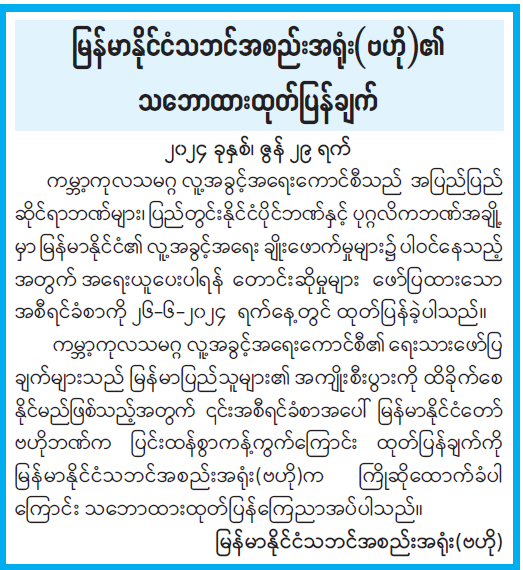 ကမ္ဘာ့ကုလသမဂ္ဂလူ့အခွင့်အရေးကောင်စီက ၂၀၂၄ ခုနှစ်၊ ဇွန်လ ၂၆ ရက်နေ့တွင် ထုတ်ပြန်ခဲ့သည့် အစီရင်ခံစာတွင် မြန်မာနိုင်ငံ၏ လူ့အခွင့်အရေးချိုးဖောက်မှုများ၌ အပြည်ပြည်ဆိုင်ရာဘဏ်များ၊ ပြည်တွင်းနိုင်ငံပိုင်ဘဏ်နှင့် ပုဂ္ဂလိကဘဏ်အချို့မှ ပါဝင်ဆောင်ရွက်လျက်ရှိကြောင်းနှင့် အရေးယူပေးပါရန် တောင်းဆိုမှုများကို ဖော်ပြထားပါသည်။