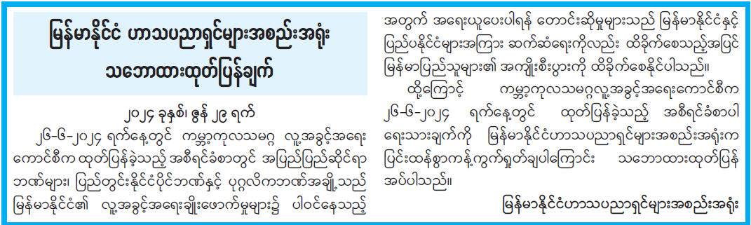 ထိုကဲ့သို့ ကမ္ဘာ့ကုလသမဂ္ဂလူ့အခွင့်အရေးကောင်စီ၏ အစီရင်ခံစာတွင် ရေးသားဖော်ပြချက်များမှာ မြန်မာပြည်သူများ၏ အကျိုးစီးပွားကို ထိခိုက်စေသည့်အပြင် မြန်မာနိုင်ငံနှင့် ပြည်ပနိုင်ငံများအကြား ဆက်ဆံရေးကိုလည်း ထိခိုက်စေသဖြင့် မြန်မာနိုင်ငံတော်ဗဟိုဘဏ်၊ မြန်မာနိုင်ငံဘဏ်များအသင်း၊ နိုင်ငံပိုင်ဘဏ်များ၊ ပုဂ္ဂလိကဘဏ်များက ၎င်းအစီရင်ခံစာတွင်ပါဝင်သည့် ရေးသားချက်များအား ပြင်းထန်စွာ ကန့်ကွက်ကြောင်း ၂၈-၆-၂၀၂၄ ရက်နေ့တွင် ထုတ်ပြန်ကြေညာခဲ့သည်။