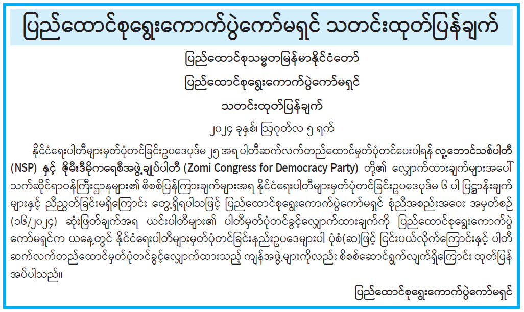 နိုင်ငံရေးပါတီများမှတ်ပုံတင်ခြင်းဥပဒေပုဒ်မ ၂၅ အရ ပါတီဆက်လက်တည်ထောင်မှတ်ပုံတင်ပေးပါရန် လူ့ဘောင်သစ်ပါတီ (NSP)  နှင့်  ဇိုမီးဒီမိုကရေစီအဖွဲ့ချုပ်ပါတီ (Zomi Congress for Democracy Party)  တို့၏  လျှောက်ထားချက်များအပေါ် သက်ဆိုင်ရာဝန်ကြီးဌာနများ၏ စိစစ်ပြန်ကြားချက်များအရ နိုင်ငံရေးပါတီများမှတ်ပုံတင်ခြင်းဥပဒေပုဒ်မ ၆ ပါ ပြဋ္ဌာန်းချက်များနှင့် ညီညွတ်ခြင်းမရှိကြောင်း တွေ့ရှိရပါသဖြင့် ပြည်ထောင်စုရွေးကောက်ပွဲကော်မရှင် စုံညီအစည်းအဝေးအမှတ်စဉ် (၁၆/၂၀၂၄)  ဆုံးဖြတ်ချက်အရ  ယင်းပါတီများ၏  ပါတီမှတ်ပုံတင်ခွင့်လျှောက်ထားချက်ကို  ပြည်ထောင်စုရွေးကောက်ပွဲကော်မရှင်က ယနေ့တွင် နိုင်ငံရေးပါတီများမှတ်ပုံတင်ခြင်းနည်းဥပဒေများပါ ပုံစံ(ဆ)ဖြင့် ငြင်းပယ်လိုက်ကြောင်းနှင့် ပါတီဆက်လက်တည်ထောင်မှတ်ပုံတင်ခွင့်လျှောက်ထားသည့် ကျန်အဖွဲ့များကိုလည်း စိစစ်ဆောင်ရွက်လျက်ရှိကြောင်း ထုတ်ပြန် အပ်ပါသည်။