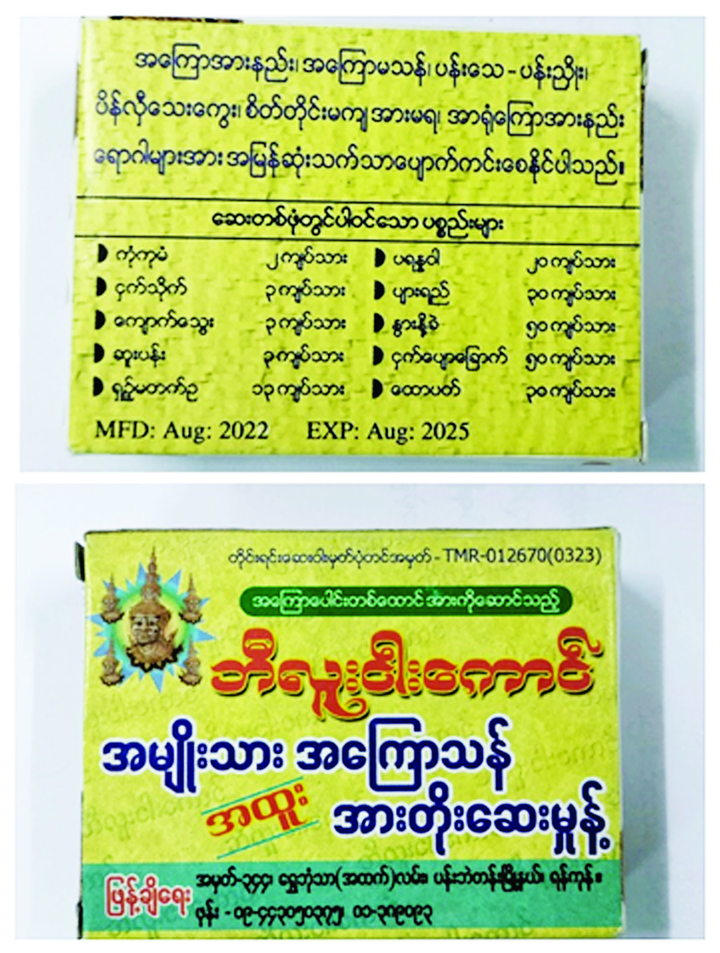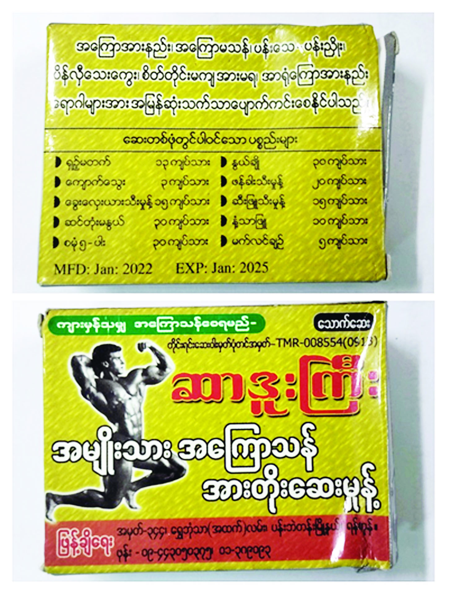 ၂။ ယင်းသို့စစ်ဆေးရာတွင် ဈေးကွက်အတွင်းတွေ့ရှိရသော ဘီလူးငါးကောင်အမှတ်တံဆိပ် အမျိုးသားအကြောသန်အားတိုးဆေးမှုန့်နှင့် ဆာဒူးကြီးအမှတ်တံဆိပ်အမျိုးသားအကြောသန် အားတိုးဆေးမှုန့်တို့သည် တိုင်းရင်းဆေးဝါးမှတ်ပုံတင်နှင့် တိုင်းရင်းဆေးဝါးထုတ်လုပ်ခွင့်လိုင်စင် ရရှိထားသော်လည်း ဈေးကွက်တွင် တိုင်းရင်းဆေးဝါးမှတ်ပုံတင်စဉ်က ဖော်ပြထားသော ဆေးဖုံ၊ ဖော်စပ်နည်းနှင့်အညီမဟုတ်ဘဲ ဖော်စပ်ထားသော တိုင်းရင်းဆေးဝါး (စံမညီတိုင်းရင်းဆေးဝါး) ဖြစ်ခြင်း သတ်မှတ်ချက် (၁၀) ချက် ပြည့်စုံမှန်ကန်မှုမရှိခြင်းနှင့် ဓာတ်ခွဲစစ်ဆေးစမ်းသပ်ချက်အရ အနောက်တိုင်းဆေး Sildenafil ပါဝင်နေသည်ကို စစ်ဆေးတွေ့ရှိရသဖြင့် စစ်မှန်အစွမ်းထက်မှုကို အာမခံချက်မပေးနိုင်သောကြောင့် အများပြည်သူများ သုံးစွဲရန် မသင့်လျော်ကြောင်း အသိပေးအပ်ပါသည်။