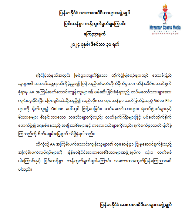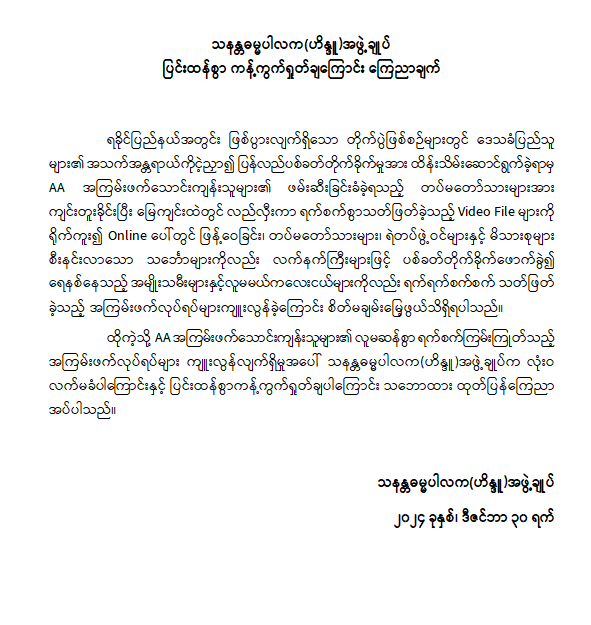 ရခိုင်ပြည်နယ်အတွင်း ဖြစ်ပွားလျက်ရှိသော တိုက်ပွဲဖြစ်စဉ်များ၌ ဒေသခံပြည်သူများ၏ အသက်အန္တရာယ်ကိုငဲ့ညှာ၍ ပြန်လည်ပစ်ခတ်တိုက်ခိုက်မှုအား ထိန်းသိမ်းဆောင်ရွက်ခဲ့ရသဖြင့် ဖမ်းဆီးခြင်းခံခဲ့ရသည့် တပ်မတော်သားများအား AA အကြမ်းဖက်သောင်းကျန်းသူများက ကျင်းတူးခိုင်းပြီး မြေကျင်းထဲသို့ထည့်၍ လည်လှီးကာသတ်ဖြတ်ခြင်း၊ အဆိုပါလည်လှီးသတ်ဖြတ်နေသည့် Video File များကို ရိုက်ကူး၍ Online ပေါ်တွင် ဖြန့်ဝေခြင်း ပြုလုပ်လျက်ရှိသည်။ ထို့ပြင် ကျောက်တော်နယ်မြေ၌လည်း တပ်မတော်သားများ ရဲတပ်ဖွဲ့ဝင်များနှင့် မိသားစုများလိုက်ပါလာသော သင်္ဘောကိုလည်း ပစ်ခတ်ဖောက်ခွဲ၍ ရေနစ်နေသည့် အမျိုးသမီးများနှင့် ကလေးငယ်များကိုလည်း ရက်ရက်စက်စက် သတ်ဖြတ်ခဲ့ကြသည်။