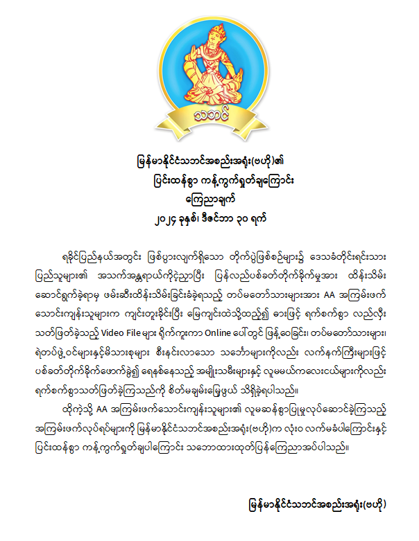 ယခုကဲ့သို့ AA အကြမ်းဖက်သောင်းကျန်းသူအဖွဲ့၏ စစ်ရာဇဝတ်မှု(War Crime) မြောက်သည့် လူမဆန်စွာရက်စက် ယုတ်မာရိုင်းစိုင်းသော အကြမ်းဖက်လုပ်ရပ်များအပေါ် မည်သို့မျှ လက်ခံနိုင်ဖွယ်ရာမရှိသည့်အတွက် ဗုဒ္ဓဘာသာကလျာဏယုဝအသင်း YMBA(ဗဟို)၊ ဘာသာပေါင်းစုံချစ်ကြည်ညီညွတ်ရေးအဖွဲ့(ဗဟို)၊ မြန်မာနိုင်ငံဧဝံဂေလိ ခရစ်ယာန်မဟာမိတ်အဖွဲ့ချုပ်၊ ပြည်ထောင်စုမြန်မာနိုင်ငံမက်သဒစ်အသင်းတော် (အောက်မြန်မာပြည်)၊ ယုံကြည်ခြင်းဧဝံဂေလိအသင်းတော်(ပဲခူး)၊ လွတ်မြောက်ခြင်းအသင်းတော်(ရန်ကုန်)၊ မြန်မာနိုင်ငံလုံးဆိုင်ရာဟိန္ဒူဘာသာရေးဗဟိုအဖွဲ့ချုပ်၊ မြန်မာနိုင်ငံလုံးဆိုင်ရာတမီလ်ဟိန္ဒူဖောင်ဒေးရှင်း(ဗဟို)၊ သနန္တဓမ္မပါလက(ဟိန္ဒူ)အဖွဲ့ချုပ်၊ မြန်မာနိုင်ငံလုံးဆိုင်ရာအစ္စလာမ်ဘာသာရေးအဖွဲ့ကြီး၊ မြန်မာနိုင်ငံသတင်းမီဒီယာကောင်စီ၊ မြန်မာနိုင်ငံစာရေးဆရာအသင်း၊ မြန်မာနိုင်ငံရုပ်ရှင်အစည်းအရုံး၊ မြန်မာနိုင်ငံဂီတအစည်းအရုံး(ဗဟို)၊ မြန်မာနိုင်ငံပန်းချီပန်းပုအစည်းအရုံး(ဗဟို)၊ မြန်မာနိုင်ငံသဘင်အစည်းအရုံး(ဗဟို)၊ မြန်မာနိုင်ငံဟာသပညာရှင်များအစည်းအရုံး၊ မြန်မာနိုင်ငံအားကစားမီဒီယာများအဖွဲ့ချုပ်နှင့် ပိန္နဲကုန်းရခိုင်ဂျာမေဗလီတို့မှ ပြင်းထန်စွာ ကန့်ကွက်ရှုတ်ချပါကြောင်း သဘောထားများ အသီးသီးထုတ်ပြန်ခဲ့ကြကြောင်း သတင်းရရှိသည်။