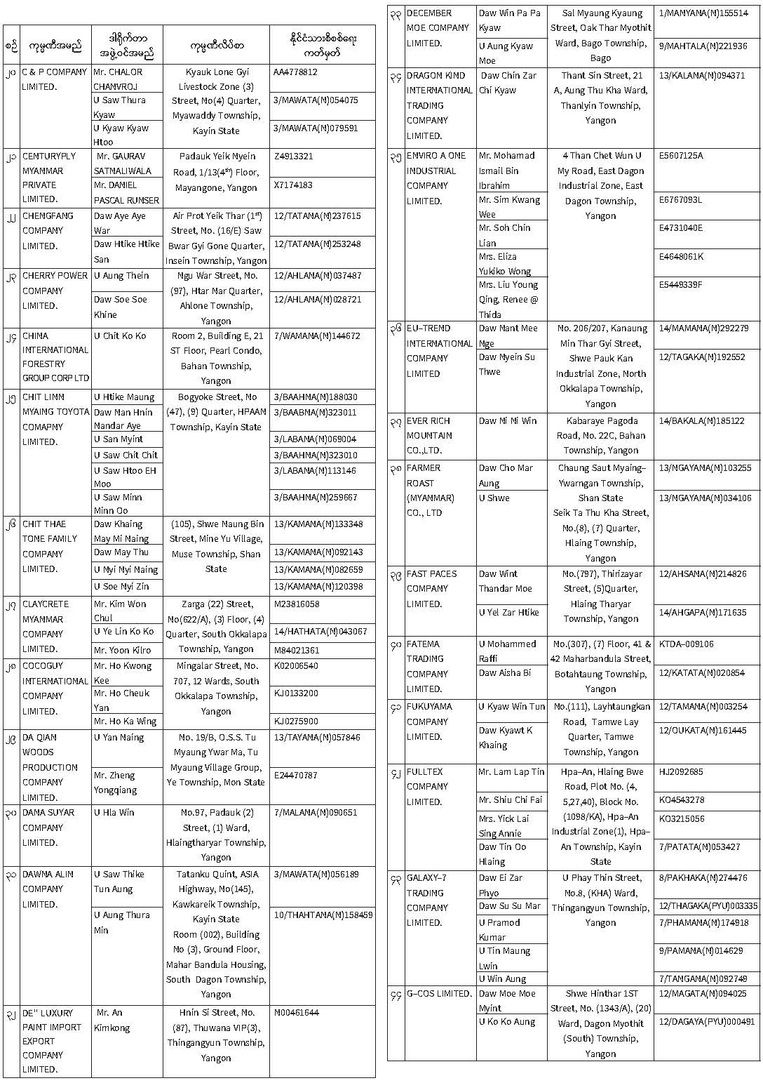 ၃။ ၂ဝ၁၆ ခုနှစ်မှ ၂ဝ၂ဝ ပြည့်နှစ်အတွင်း ပို့ကုန်တင်ပို့ခဲ့သည့် ပို့ကုန် လုပ်ငန်းရှင်များသည် ပို့ကုန်ရငွေများကို သတ်မှတ်ကာလအတွင်း ယင်း၏ ဘဏ်ငွေစာရင်းသို့ နိုင်ငံခြားသုံးငွေဖြင့် မပျက်မကွက် ပြန်လည်ထည့်သွင်းစေရေးအတွက် ကုန်သွယ်မှုနှင့် ကုန်စည်စီးဆင်းမှုများ မှန်ကန်မြန်ဆန်စေရေး ဗဟိုကော်မတီ၊ စီမံကိန်းနှင့်ဘဏ္ဍာရေးဝန်ကြီးဌာန၊ ရင်းနှီးမြှုပ်နှံမှုနှင့် နိုင်ငံခြားစီးပွားဆက်သွယ်ရေးဝန်ကြီးဌာန၊ စီးပွားရေးနှင့်ကူးသန်းရောင်းဝယ်ရေးဝန်ကြီးဌာန၊ မြန်မာနိုင်ငံတော် ဗဟိုဘဏ်နှင့် AD လိုင်စင်ရဘဏ်များပူးပေါင်း၍ ဆက်သွယ်ခေါ်ယူ စာရင်းရှင်းလင်းခဲ့ပြီးနောက် စာရင်းရှင်းလင်းခြင်းမရှိသည့် ကုမ္ပဏီများအား ပို့ကုန်သွင်းကုန်လုပ်ငန်းရှင် မှတ်ပုံတင်လက်မှတ် ပိတ်သိမ်းခြင်းကို ဆောင်ရွက်ခဲ့ပြီးဖြစ်ပါသည်။