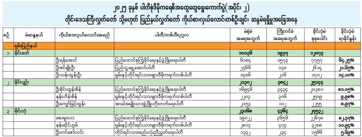 ၂၀၂၅ ခုနှစ် ပါတီစုံဒီမိုကရေစီအထွေထွေရွေးကောက်ပွဲ (အပိုင်း ၂) တိုင်းဒေသကြီးလွှတ်တော် သို့မဟုတ် ပြည်နယ်လွှတ်တော်ကိုယ်စားလှယ်လောင်းတစ်ဦးချင်း ဆန္ဒမဲရရှိမှုအခြေအနေ